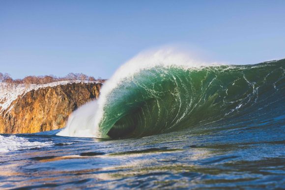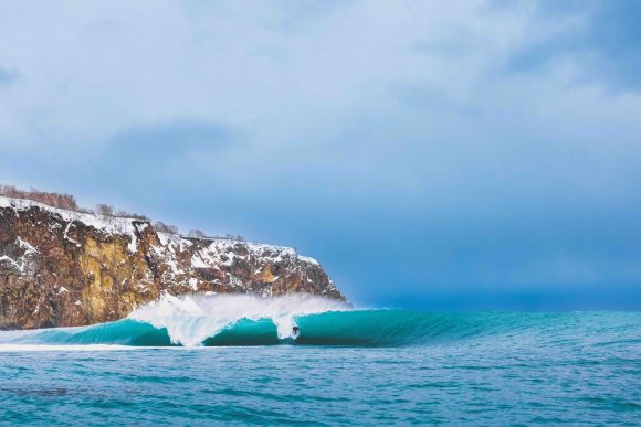 “When we started looking at weather maps, we saw that during winter Kamchatka gets one or two big swells with offshore winds. We thought if we could access the coastline and catch one of these swells, we might be able to capture something really amazing. We started talking to helicopter pilots and seeing how to get to these parts of the coastline, because there is no roads there in winter – everything is covered in metres of snow.”